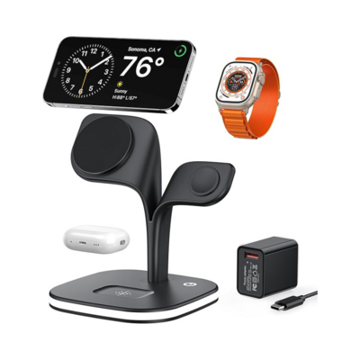 EXW Magnetic 3-in-1 Charging Station keeps my iPhone, watch, and AirPods charged and organised in one spot.