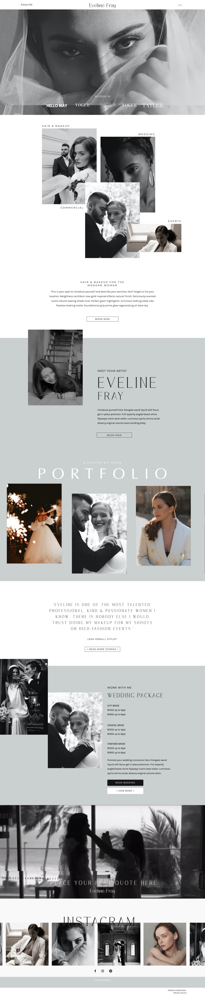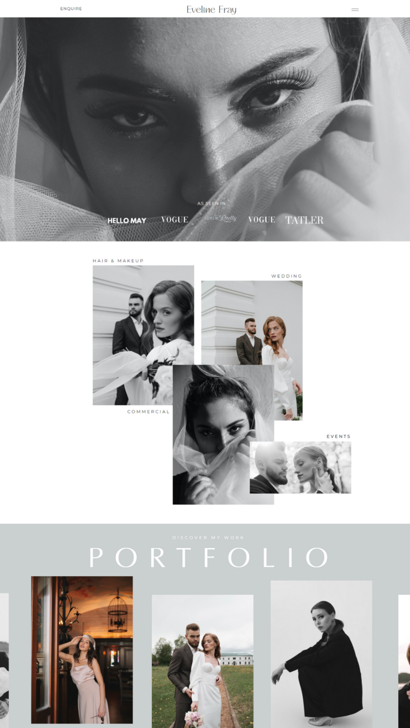 The Eveline Fray template is designed to bring your HMUA business online in true elegant, minimalist fashion. Strategically designed for you, the hair and makeup artist, to showcase your wedding, events, commercial and education work with ease.